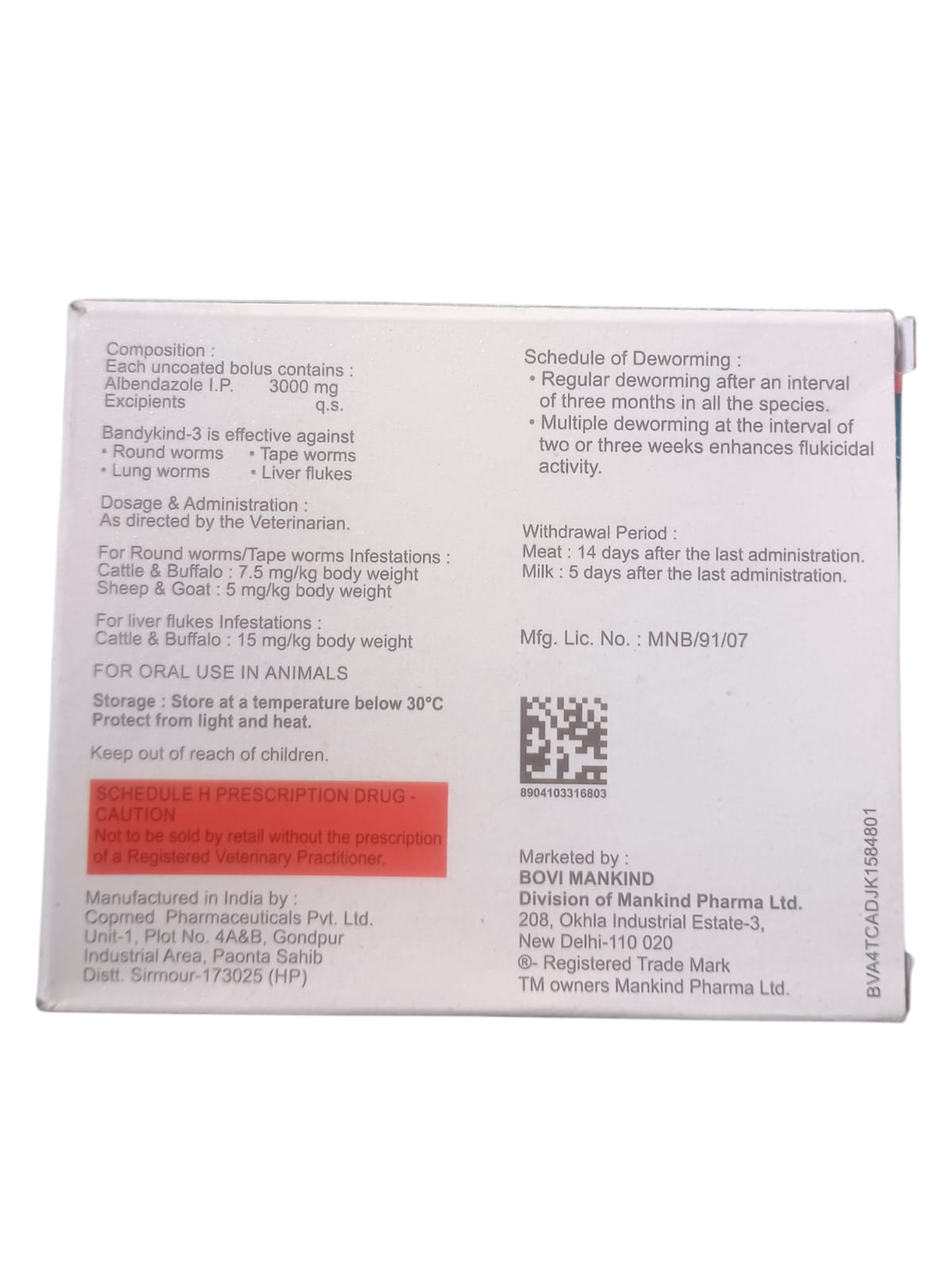 For Round worms/Tape worms Infestations: Cattle & Buffalo: 7.5 mg/kg body weight